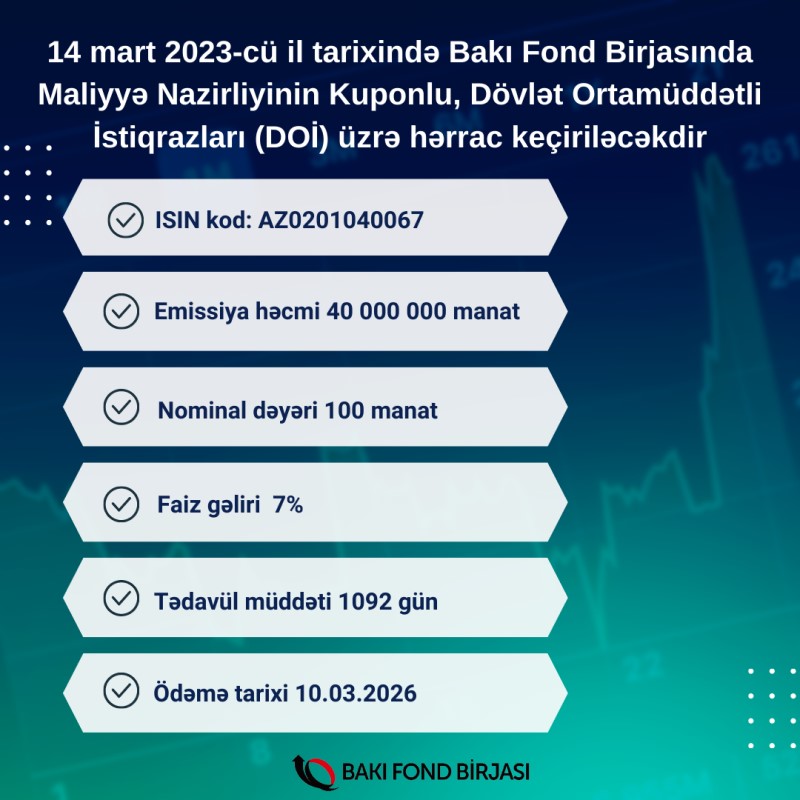 14 mart 2023-cü il tarixində Bakı Fond Birjasında Maliyyə Nazirliyinin Kuponlu, Dövlət Ortamüddətli İstiqrazları (DOİ) üzrə hərrac keçiriləcəkdir.