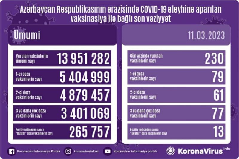 Azərbaycanda son sutkada koronavirus (COVID-19) əleyhinə 230 vaksin vurulub. Bir gündə birinci mərhələ üzrə vaksinasiya olunanların sayı 79, ikinci mərhələ üzrə vaksinasiya olunanların sayı 61, üç və daha çox doza üzrə vaksinasiya olunanların sayı 77, pozitiv nəticədən sonra buster doza üzrə vaksinasiya olunanların sayı 13 nəfərdir.