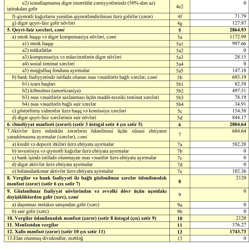 “Ziraat Bank Azərbaycan” ASC qeyri-faiz əməliyytları üzrə zərər edib. Belə ki, Bankın 2 milyon 69 min manat qeyri- faiz gəlirinə qarşı, qeyri-faiz xərcləri 2 milyon 865 min manat təşkil edib.