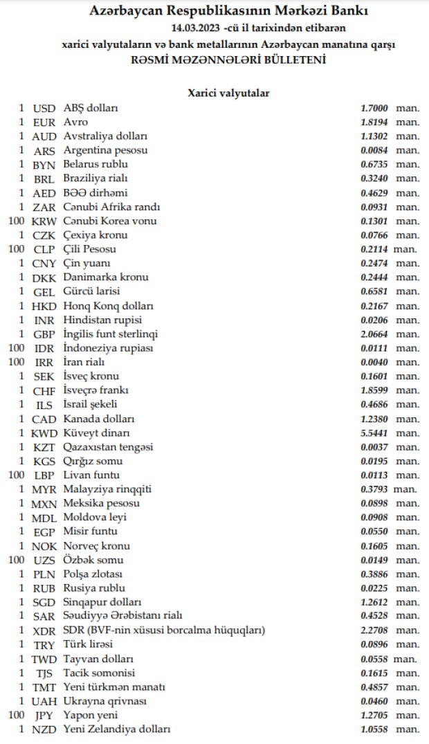 Dolların bazar ertəsi üçün rəsmi məzənnəsi müəyyən olunub