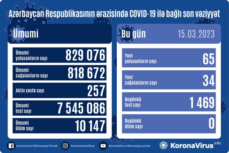 Azərbaycanda koronavirus (COVID-19) infeksiyasına 65 yeni yoluxma faktı qeydə alınıb, 34 nəfər müalicə olunaraq sağalıb.
