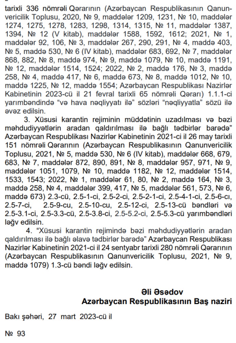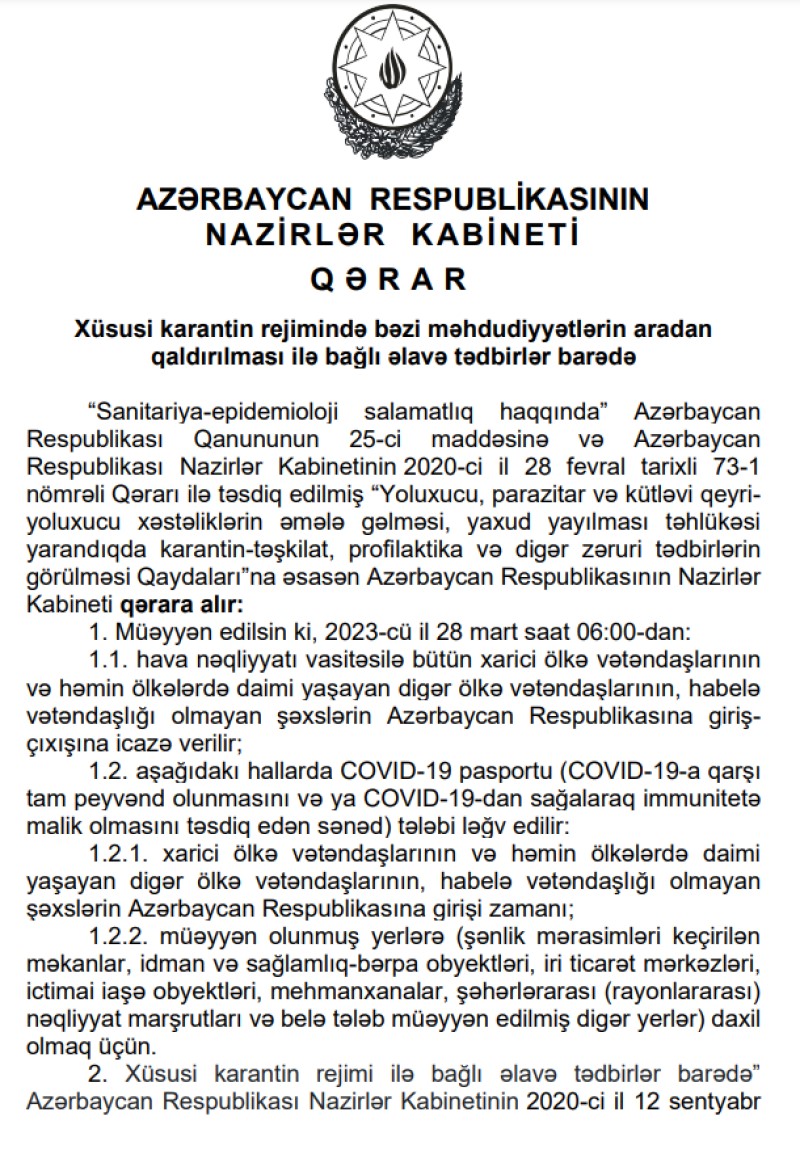 Marja.az-ın Nazirlər Kabinetinin qərarına istinadən məlumatına görə, müəyyən edilib ki, 2023-cü il 28 mart saat 06:00-dan hava nəqliyyatı vasitəsilə bütün xarici ölkə vətəndaşlarının və həmin ölkələrdə daimi yaşayan digər ölkə vətəndaşlarının, habelə vətəndaşlığı olmayan şəxslərin Azərbaycan Respublikasına giriş-çıxışına icazə verilib.