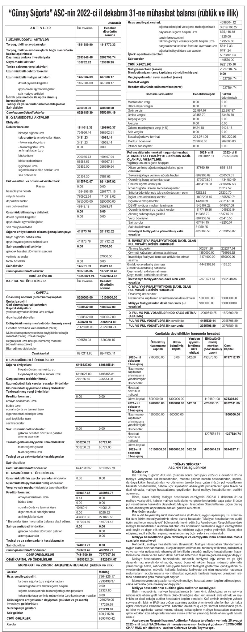 "Günay Sığorta" ASC 2022-ci ili 1 milyon 227 min manat xalis zərər ilə başa vurub. Şirkət 2021-ci ili 1 milyon 125 min manat xalis zərər ilə bağlamışdı. Beləliklə, "Günay Sığorta"nın zərəri 9% artıb.