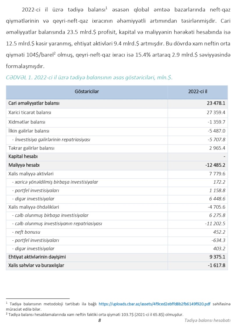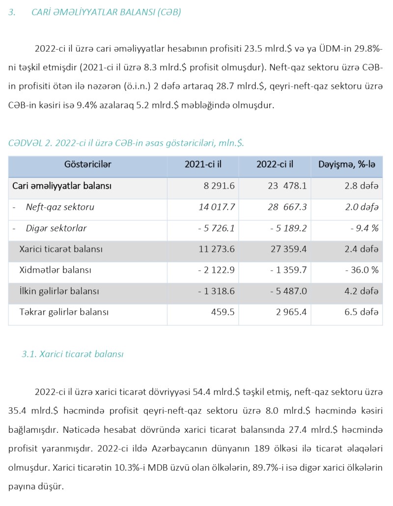 Qeyd edilib ki, 2022-ci il üzrə tədiyə balansı əsasən qlobal əmtəə bazarlarında neft-qaz qiymətlərinin və qeyri-neft-qaz ixracının əhəmiyyətli artımından təsirlənmişdir.