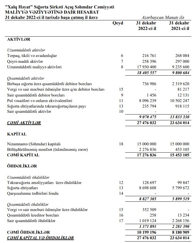 "Xalq Həyat"ın investisiya gəlirləri 2021-ci illə müqayisədə 2022-ci ildə 19% artaraq 1 milyon 721 min manat təşkil edib.