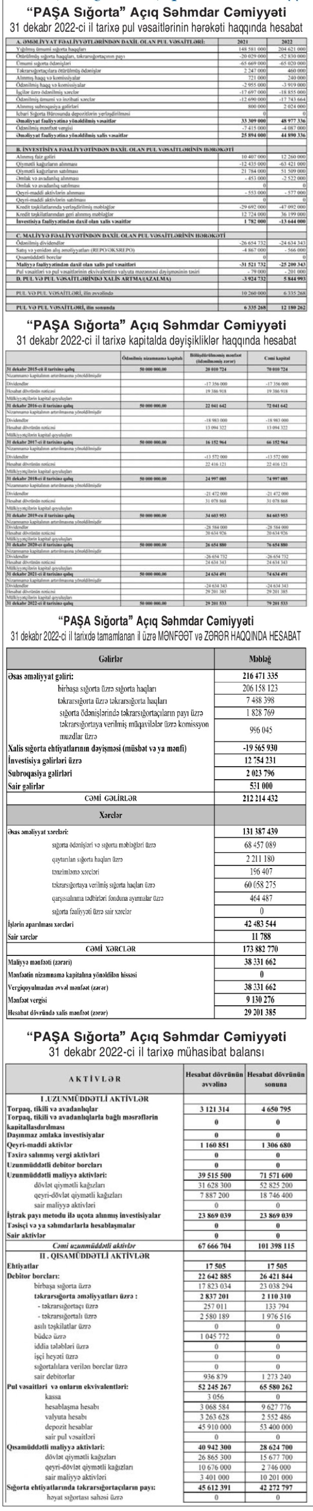 "PAŞA Sığorta" ASC 2022-ci ili 29 milyon 201 min manat xalis mənfəət ilə başa vurub. Şirkət 2021-ci ili 24 milyon 634 min manat xalis mənfəət ilə başa vurmuşdu. Beləliklə, "PAŞA Sığorta"nın xalis mənfəəti 2021-ci illə müqayisədə 2022-ci ildə 4 milyon 567 min manat və ya 18,5% artıb.