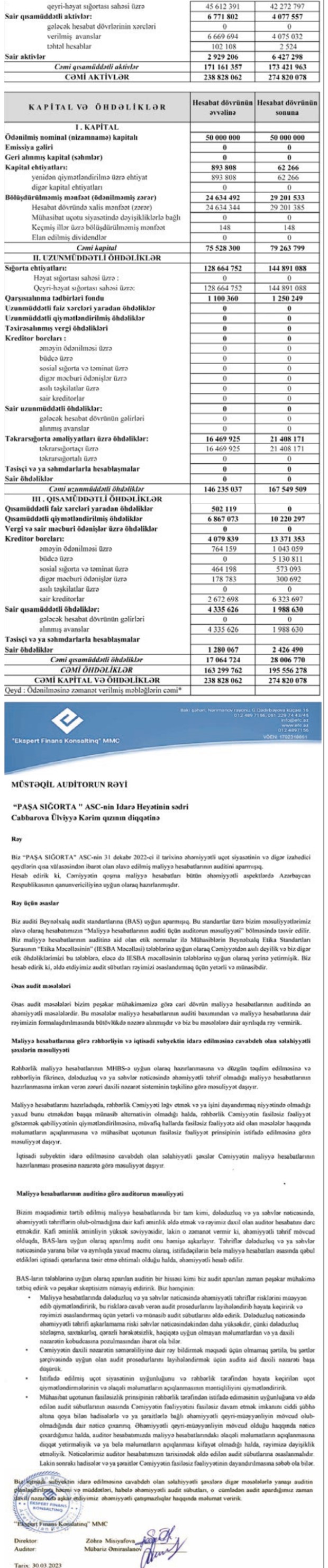 2021-ci ildə "PAŞA Sığorta"nın topladığı sğorta haqları 166 milyon 866 min manat ikən, 2022-ci ildə 206 milyon 158 min manat təşkil edib. Şirkətin sığorta ödənişləri isə 2021-ci ildəki 75 milyon 26 min manata qarşı, 2022-ci ildə 68 milyon 457 min manat olub.
