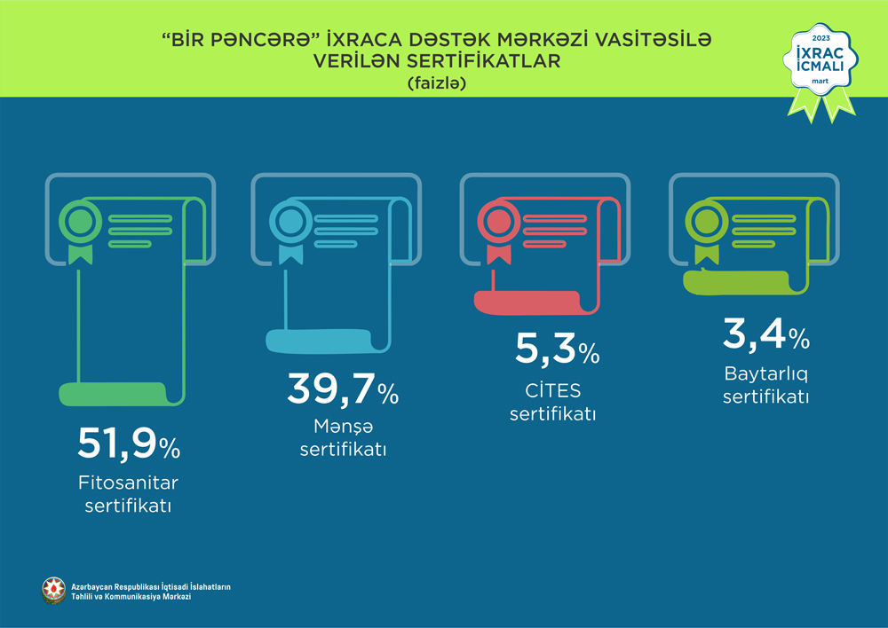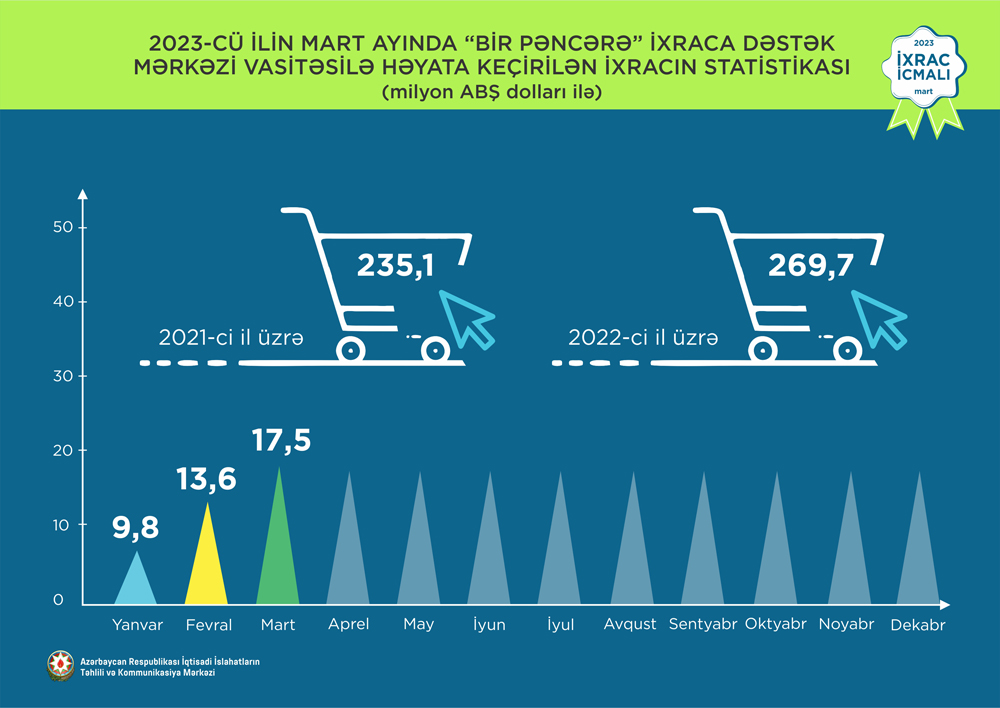 “İxrac İcmalı”nda göstərilib ki, 2023-cü ilin mart ayında “Bir Pəncərə” İxraca Dəstək Mərkəzi vasitəsi ilə həyata keçirilən qeyri-neft ixracının dəyəri 17,5 milyon ABŞ dolları olub.