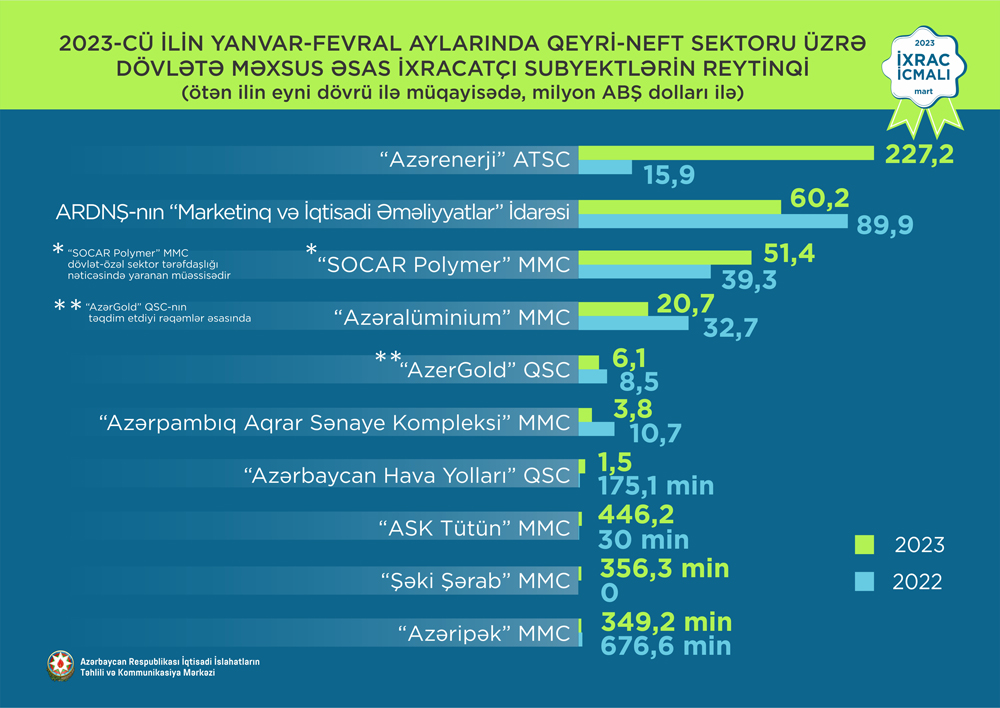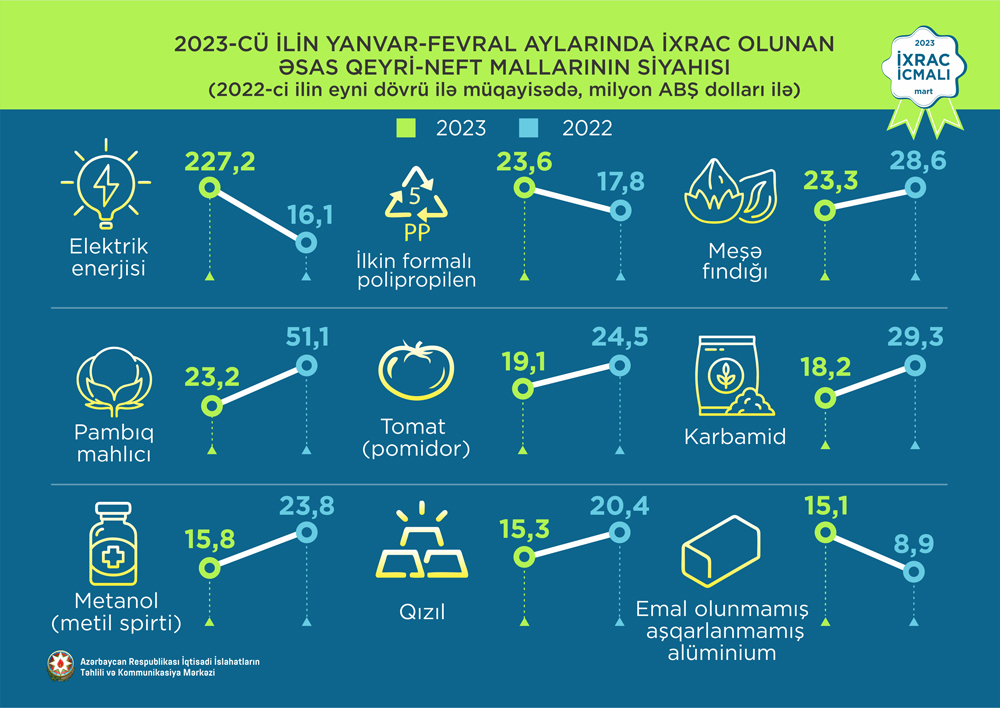 2023-cü ilin yanvar-fevral ayları ərzində ixrac edilən qeyri-neft sektoruna aid malların siyahısında elektrik enerjisi (227,2 milyon ABŞ dolları) birinci olub. Bu siyahıda ilkin formalı polipropilen (23,6 milyon ABŞ dolları) ikinci, meşə fındığı (23,3 milyon ABŞ dolları) isə üçüncü yerdə qərarlaşıb.