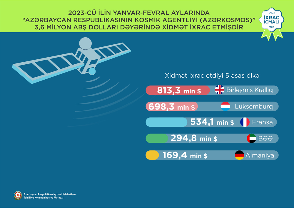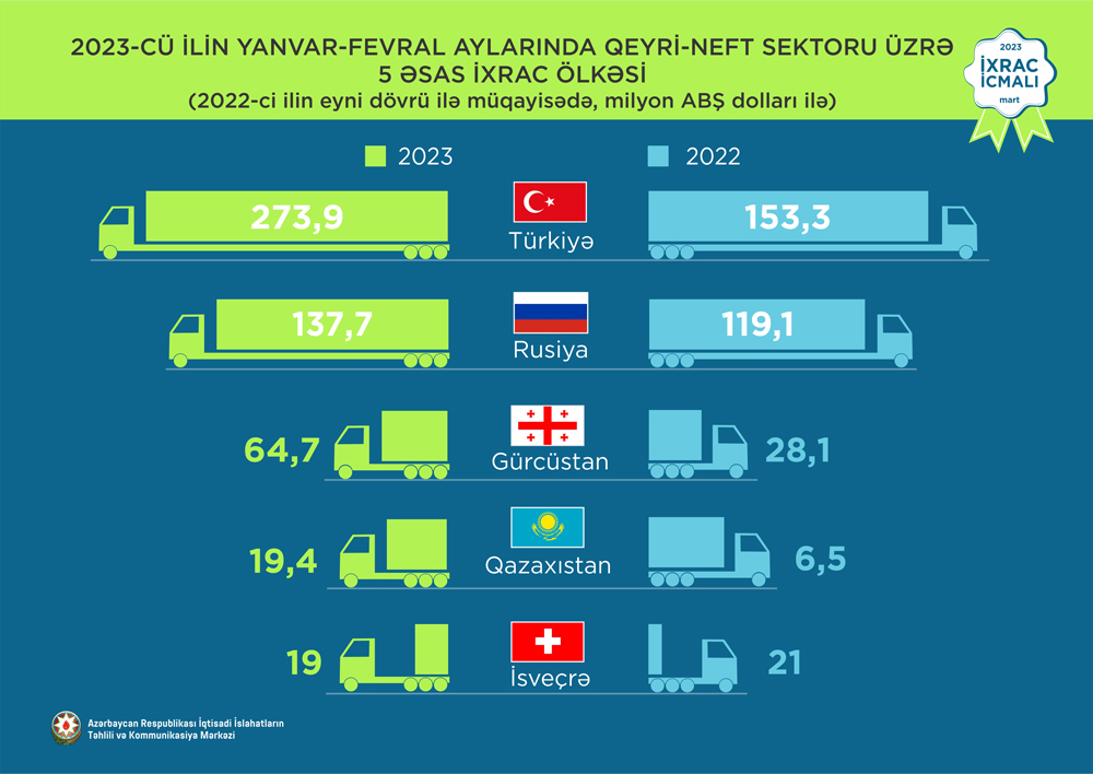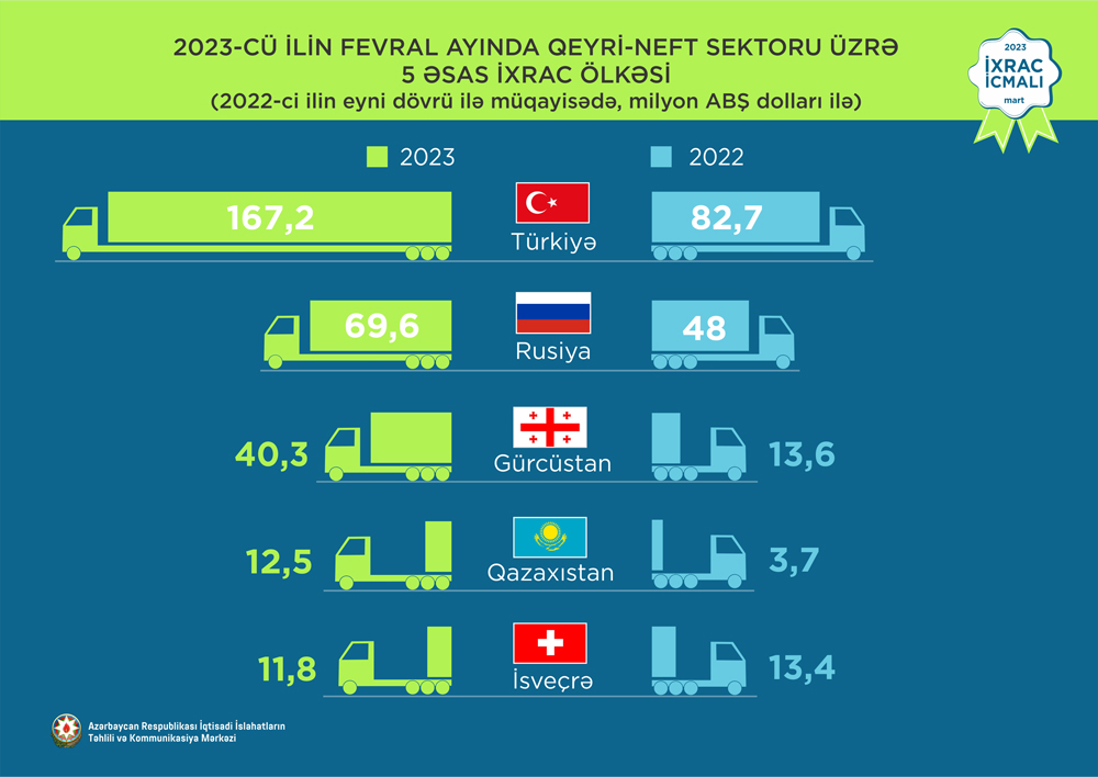 2023-ci ilin yanvar-fevral ayları ərzində Türkiyəyə 273,9 milyon ABŞ dolları, Rusiya Federasiyasına 137,7 milyon ABŞ dolları, Gürcüstana 64,7 milyon ABŞ dolları, Qazaxıstana 19,4 milyon ABŞ dolları və İsveçrə Konfederasiyasına isə 19 milyon ABŞ dolları dəyərində qeyri-neft sektoruna aid mal ixrac olunub.
