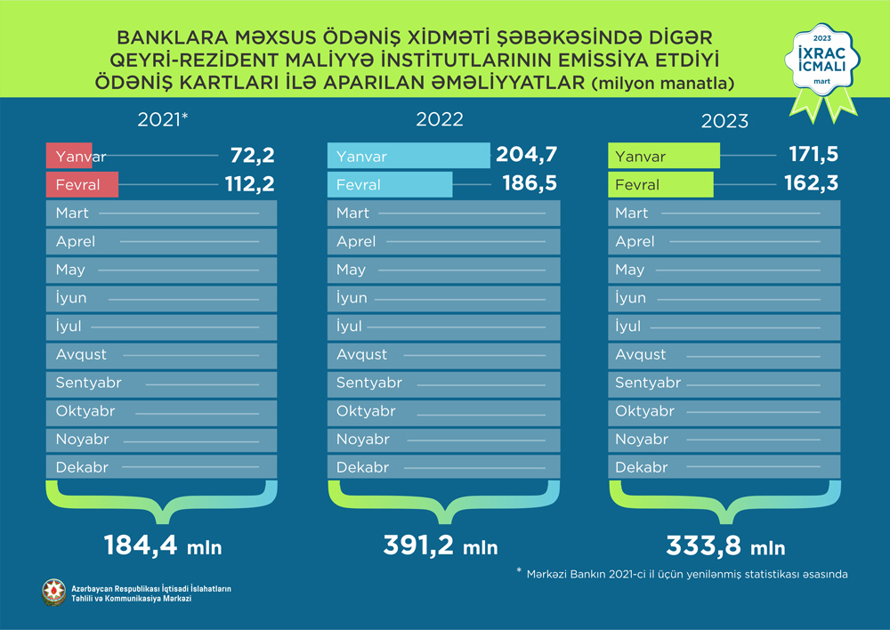 2023-cü ilin fevral ayında qeyri-neft sektoruna aid ən çox mal ixrac edilən ölkələrin siyahısında Türkiyə (167,2 milyon ABŞ dolları) birinciliyə yüksəlib. Bu siyahıda Rusiya Federasiyasına (69,6 milyon ABŞ dolları) ikinci və Gürcüstana (40,3 milyon ABŞ dolları) üçüncü olub.