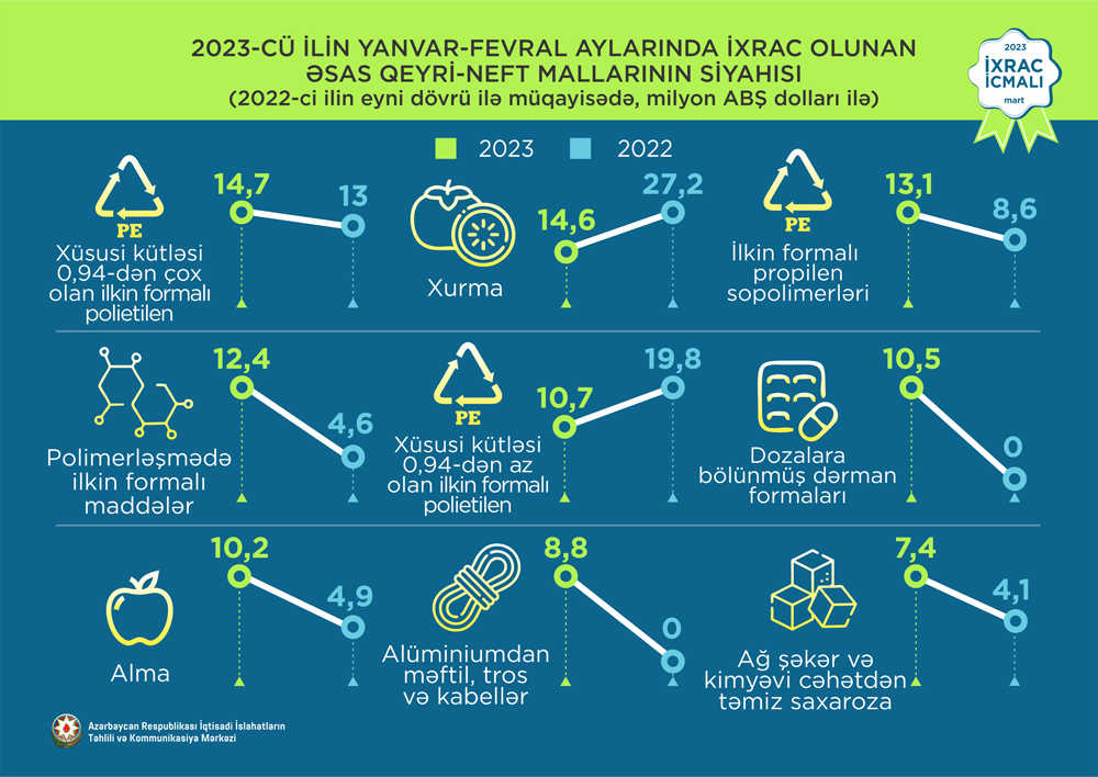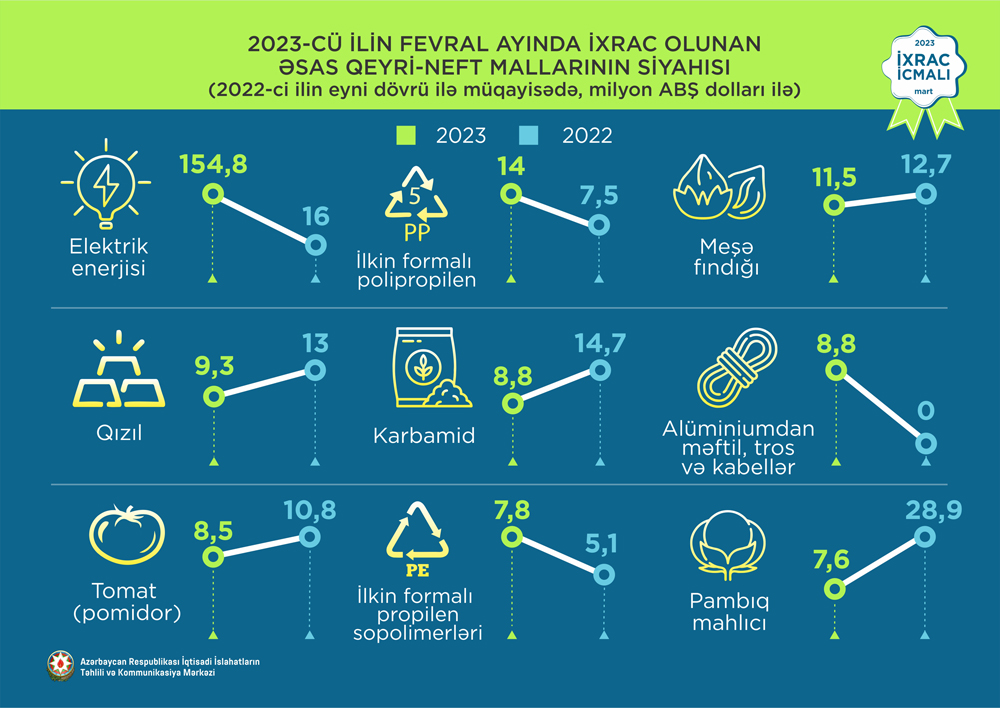 2023-cü ilin fevral ayında ixrac edilən qeyri-neft sektoruna aid malların siyahısında elektrik enerjisi (154,8 milyon ABŞ dolları) birinci, ilkin formalı polipropilen (14 milyon ABŞ dolları) ikinci və meşə fındığı (11,5 milyon ABŞ dolları) üçüncü olub.