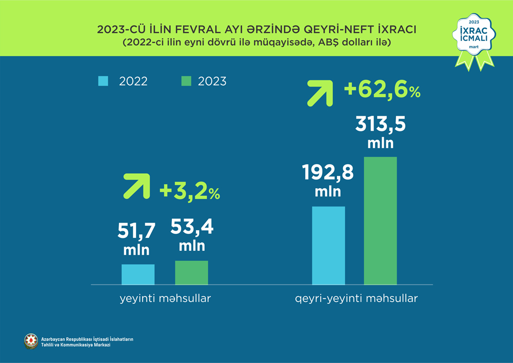 2023-cü ilin fevral ayının qeyri-neft ixracı 366,9 milyon ABŞ dolları təşkil edib. 2023-cü ilin fevral ayı ərzində yeyinti məhsulları üzrə ixrac 53,4 milyon ABŞ dolları, qeyri-yeyinti məhsulları üzrə isə 313,5 milyon ABŞ dollarına bərabər olub.