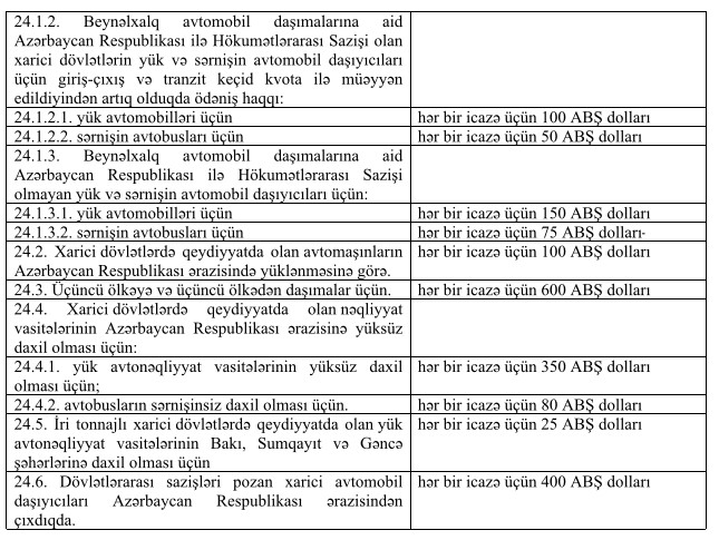 24.1.2. Beynəlxalq avtomobil daşımalarına aid Azərbaycan Respublikası ilə Hökumətlərarası Sazişi olan xarici dövlətlərin yük və sərnişin avtomobil daşıyıcıları üçün giriş-çıxış və tranzit keçid kvota ilə müəyyən edildiyindən artıq olduqda ödəniş haqqı: