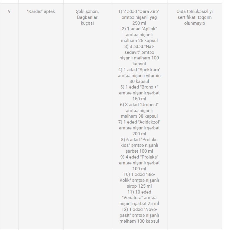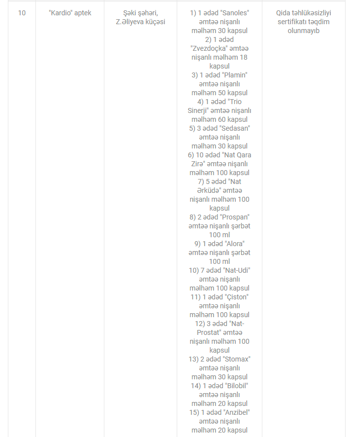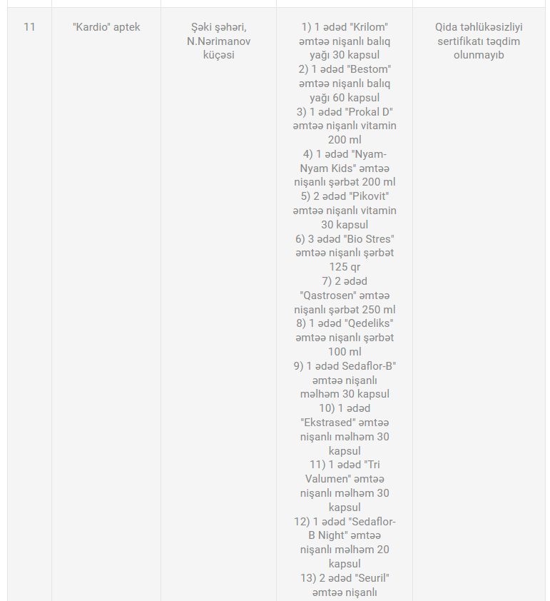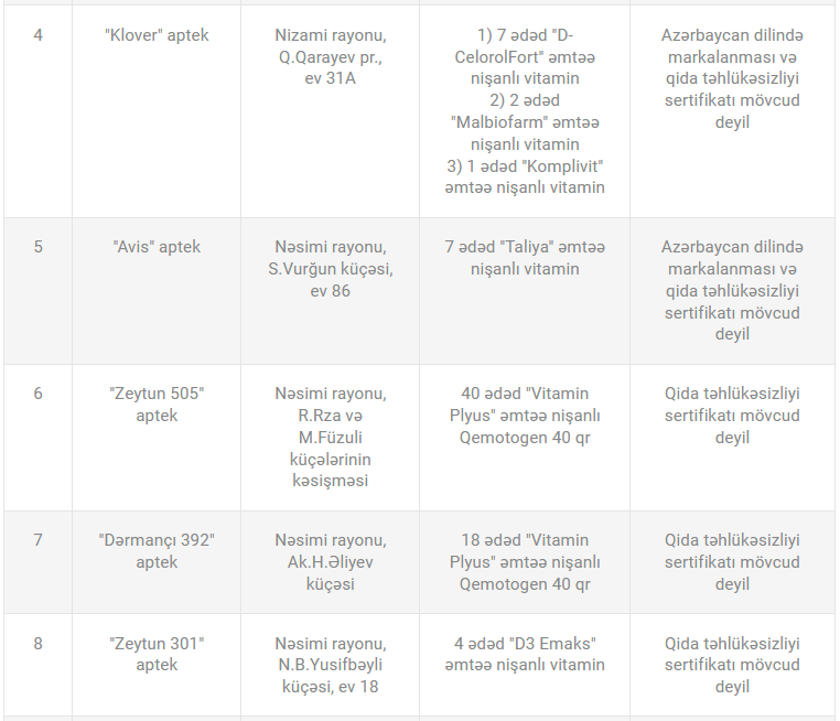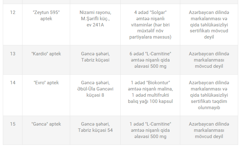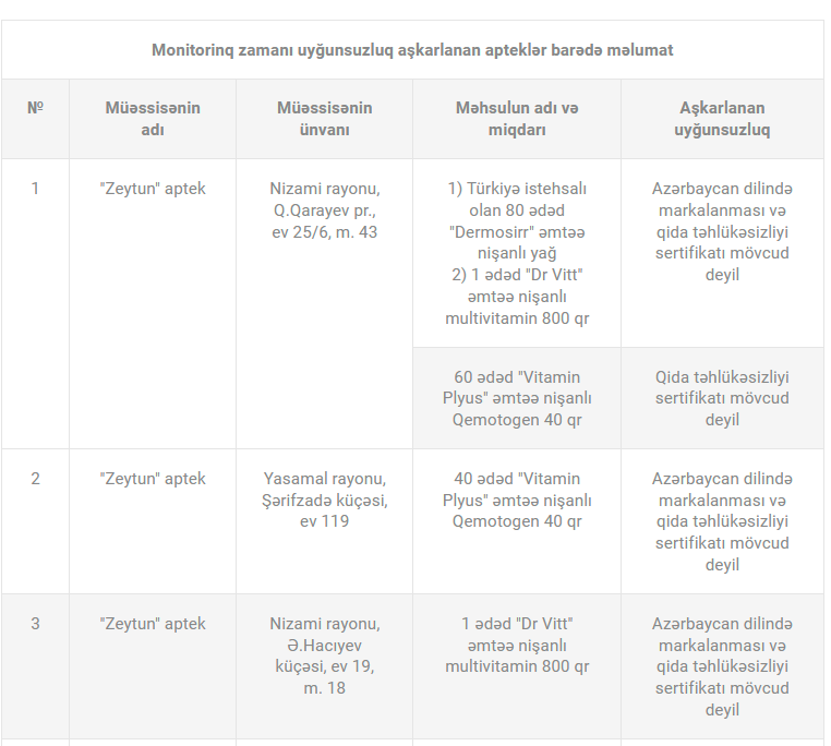 Adları çəkilən apteklərin satdıqları bir sıra məhsullar üçün Azərbaycan dilində markalanması və qida təhlükəsizliyi sertifikatı mövcud deyil: "Zeytun" aptek,"Zeytun 301" aptek, "Zeytun 505" aptek, "Zeytun 595" aptek, "Klover" aptek, "Avis" aptek, "Dərmançı 392" aptek, "Kardio" aptek, "Evro" aptek, "Gəncə" aptek.Azərbaycan Respublikasının Qida Təhlükəsizliyi Agentliyi (AQTA) ölkə ərazisində qanunvericiliyin tələbləri çərçivəsində qida təhlükəsizliyinin təmin olunması və istehlakçı hüquqlarının müdafiəsi sahəsində tədbirlər çərçivəsində, Agentliyin əməkdaşları tərəfindən 2023-cü ilin yanvar və fevral ayları ərzində ölkə ərazisində bioloji aktiv qida məhsullarının dövriyyəsini həyata keçirən 96 aptekdə yoxlama aparılıb.