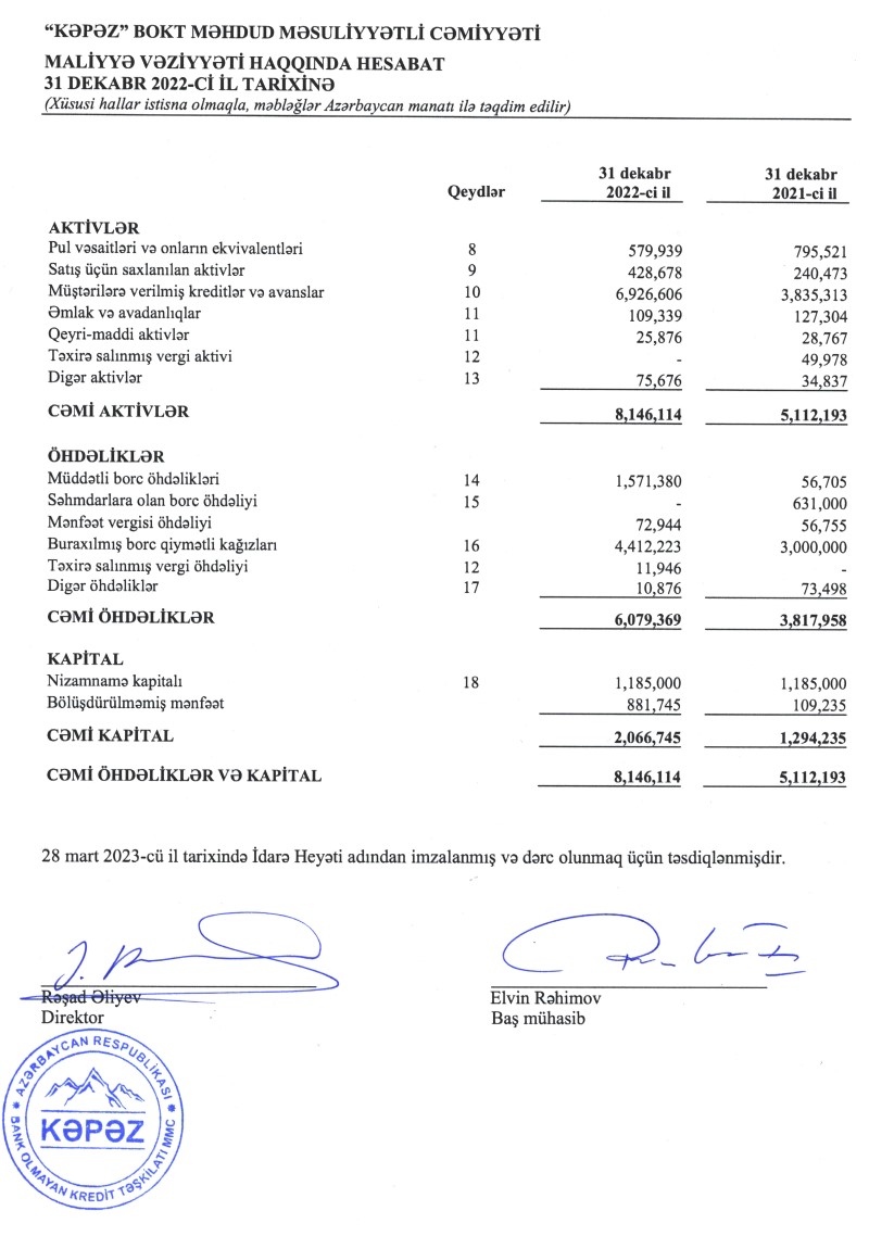 "Kəpəz BOKT"un kredit portfeli (müştərilərə verilmiş kreditlər) 2021-ci illə müqayisədə 2022-ci ildə 1,8 dəfə (80,6%) artaraq 6 milyon 927 min min manata çatıb. Ötən il kredit təşkilatının cəmi aktivləri isə 3 milyon 33 min manat və ya 59,3% artaraq 8 milyon 146 min manata yüksəlib.
