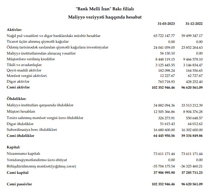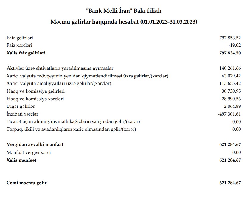 Əgər Bank Melli İran Bakı filialı 2022-ci ilin 1-ci rübündə aktivlər üzrə ehtiyatların yaradılmasına 106 min 697 manat ayırmışdısa, 2023-cü ilin 1-ci rübündə ehtiyatdan azad olmuş 140 min 261 manat gəlirlə əlavə edilib. Bu əlavə, həmçinin, xarici valyuta mövqeyinin yenidən qiymətləndirilməsi üzrə gəlirlər, xarici valyuta əməliyyatları üzrə gəlirlər və faiz xərclərinin azalması Bank Melli İran Bakı filialının xalis mənfəətinin artmasını təmin ediblər.