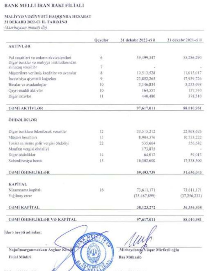 Bank Melli İran Bakı filialı 2021-ci ili 1 milyon 24 min manat xalis zərər ilə bağlamışdı. Xalis zərər Bankın ehtiyata atyırma etməsi ilə əlaqədar idi.