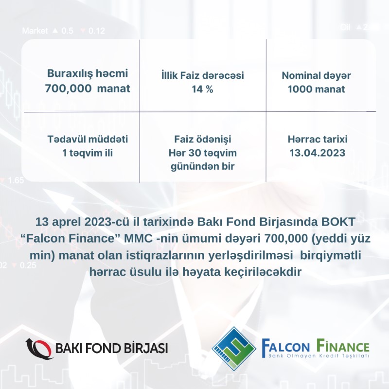 27 fevral 2023-cü il tarixində Bakı Fond Birjasının (BFB) Listinq Komitəsinin qərarı ilə BOKT “Falcon Finance” MMC -nin ümumi dəyəri 700 min manat olan istiqrazları standart bazar seqmentində listinqə daxil edilib.