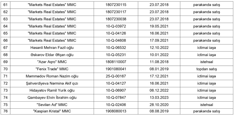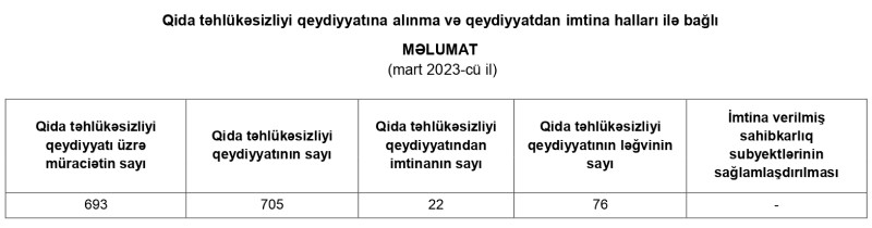 Marja xəbər verir ki, 2023-cü ilin Mart ayında AQTA tərəfindən 76 sahibkarlıq subyektinin "Qida təhlükəsizliyi qeydiyyatı" ləğv edilib.