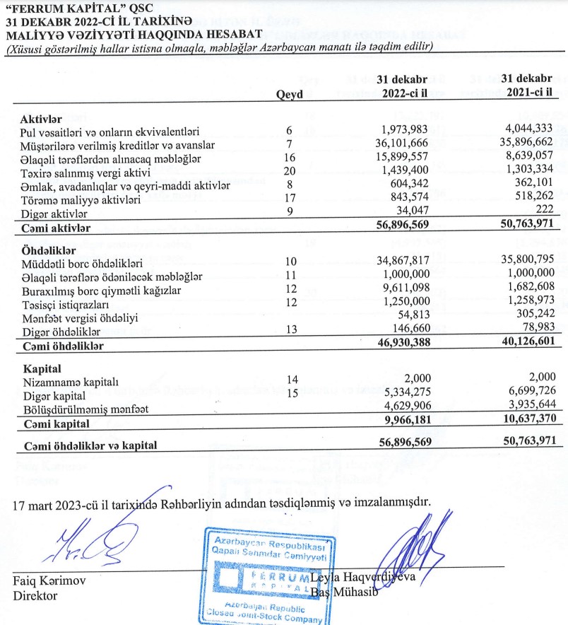 Həmçinin "Ferrum Kapital" şirkətinin 34 milyon 868 min manat müddətli borc öhdəlikləri olub.