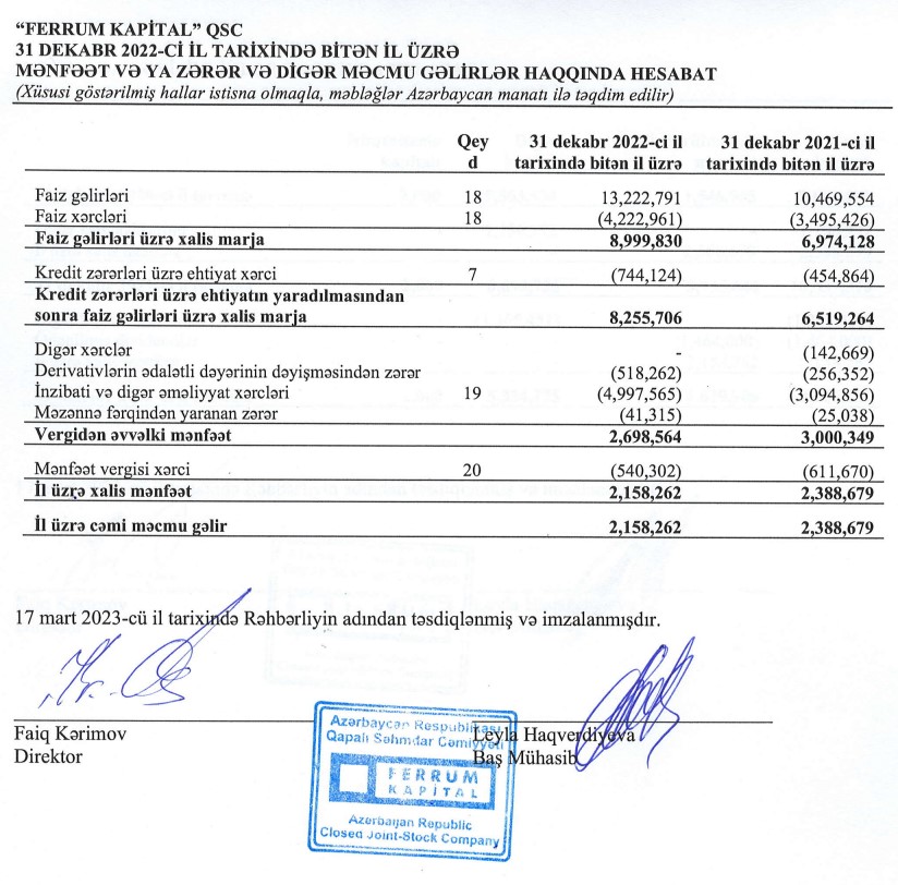 Marja maliyyə hesabatlarına xəbər verir ki, "Ferrum Kapital"ın faiz gəlirləri 2021-ci ildə 10 milyon 470 min manat ikən, 2022-ci ildə 13 milyon 223 min manata yüksəlib (2 milyon 753 min manat və ya 26,3% artıb).