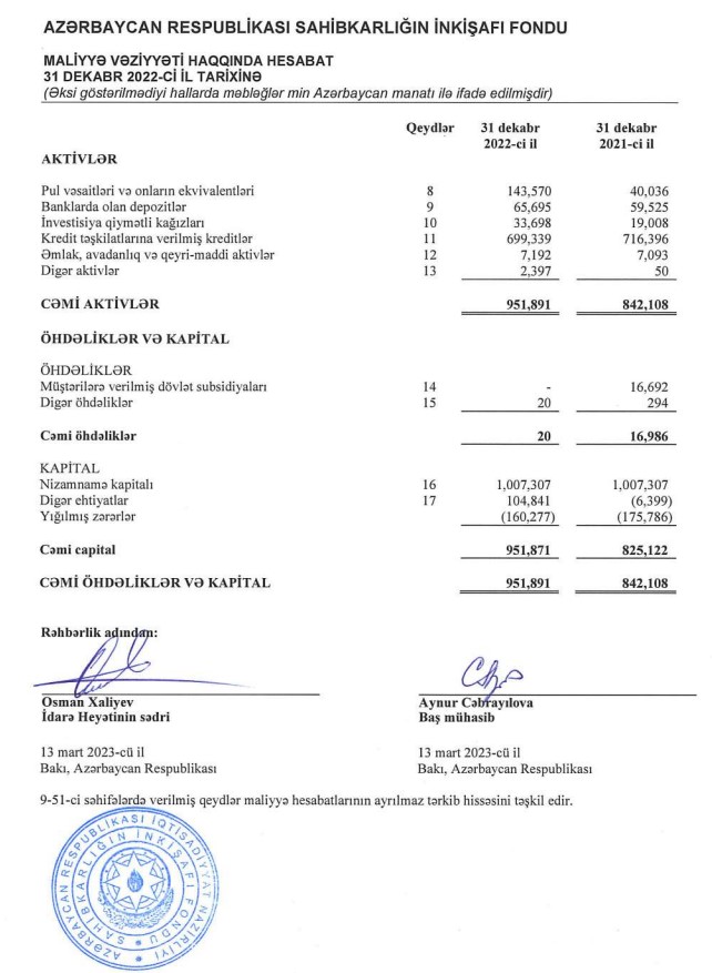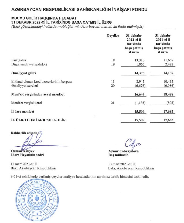 Digər əməliyyat gəlirləri azaldığından, eyni zamanda əməliyyat xərcləri və mənfəət vergisi xərcləri artdığından Fondun xalis mənfəəti aşağı düşüb.