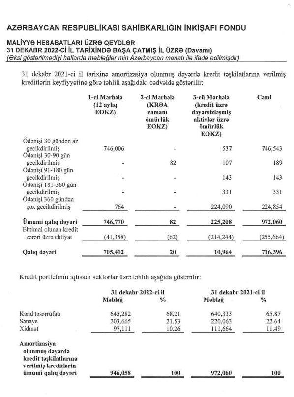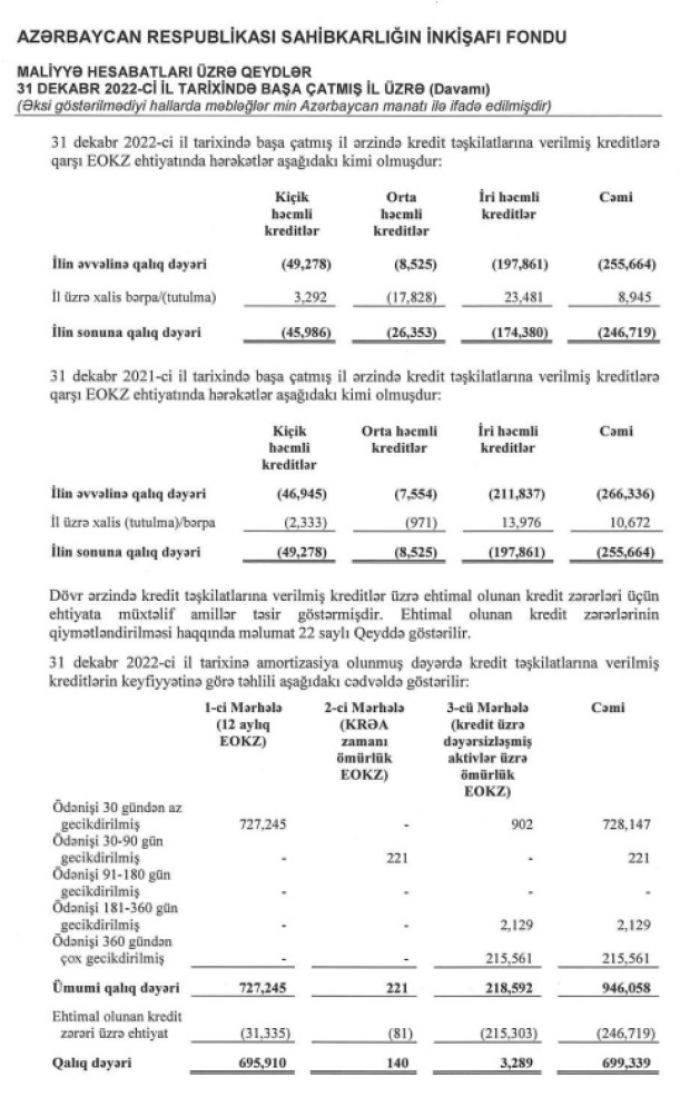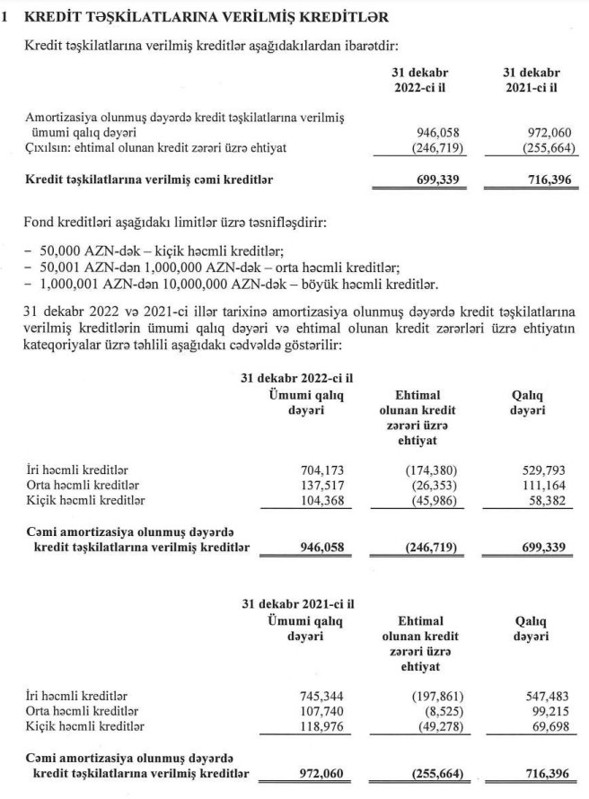 31 Dekabr 2022-ci il tarixində kredit təşkilatlarına verilmiş 946 milyon 58 min manat cəmi kreditin 246 milyon 719 min manatını və ya 26%-ni ehtimal olunan kredit zərərləri üzrə ehtiyat təşkil edib. Qalıq məbləğ (xalis kreditlər) 699 milyon 339 min manat olub.
