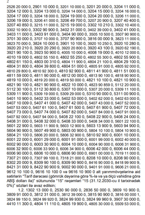 270 mal növü 2031-ci ilədək gömrük rüsumundan azad edildi