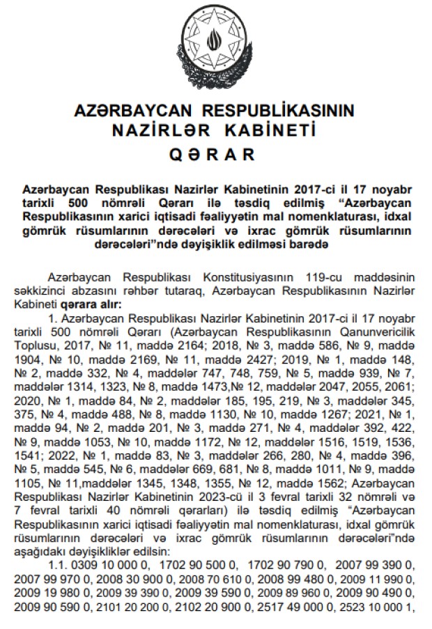 Bununla bağlı Baş nazir Əli Əsədov Nazirlər Kabinetinin “Azərbaycan Respublikasının xarici iqtisadi fəaliyyətin mal nomenklaturası, idxal gömrük rüsumlarının dərəcələri və ixrac gömrük rüsumlarının dərəcələri”ndə dəyişiklik edilməsi barədə qərar imzalayıb.