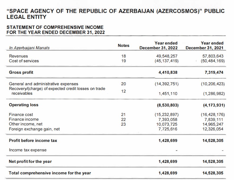 “Azərbaycan Respublikasının Kosmik Agentliyi (Azərkosmos)” publik hüquqi şəxsi 2022-ci ilin yekunlarına dair maliyyə nəticələrini açıqlayıb.