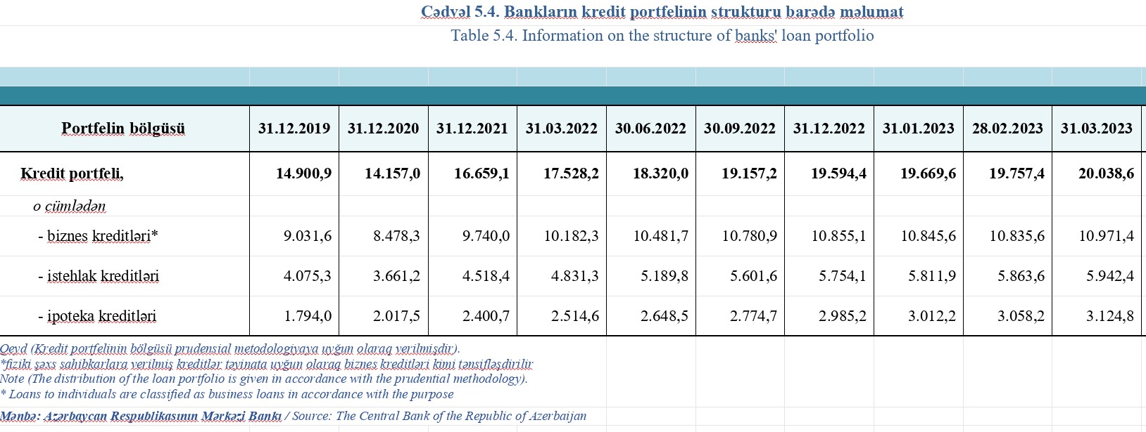 31.03.2023-cü il tarixində biznes kreditlərinin 506,1 milyon manatını və ya 4,6%-ni, istehlak kreditlərinin 45,4 milyon manatını və ya 0,8%-ni, ipoteka kreditlərinin isə 197,9 milyon manatını və ya 6,3%-ni qeyri-işlək kreditlər təşkil edib (cəmi qeyri-işlək kreditlər 749,5 milyon manat olub).