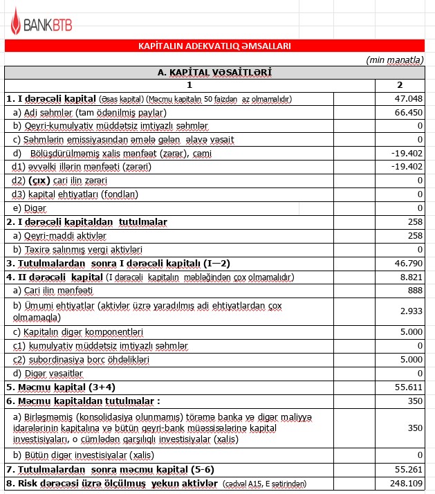 31 Mart 2023-cü il tarixində "Bank BTB" 55 milyon 261 min manat məcmu kapitala malik olub. Bank ötən il eyni dövründə 50 milyon 111 min manat məcmu kapitala malik idi.