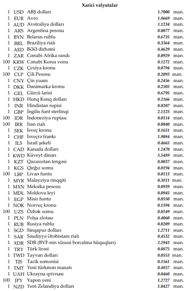 Azərbaycan Respublikasının Mərkəzi Bankı xarici valyutaların və bank metallarının Azərbaycan manatına qarşı RƏSMİ MƏZƏNNƏLƏRİ BÜLLETENİ