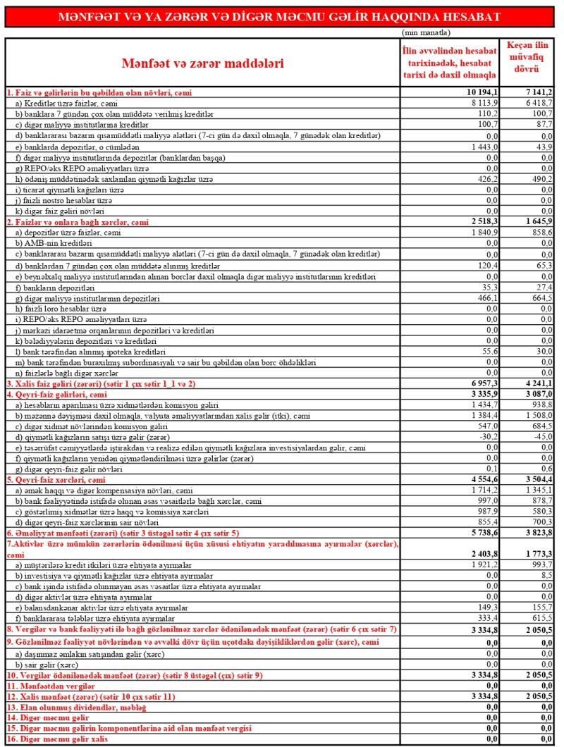 Bankda əhəmiyyətli artımın müşahidə edildiyi göstəricilərdən biri də xalis faiz gəliridir. Bu göstərici üzrə artım ötən ilin I rübü ilə müqayisədə 64% təşkil edib və beləliklə, xalis faiz gəliri hesabat dövrü üzrə 6 mln. 957 min manata çatıb.