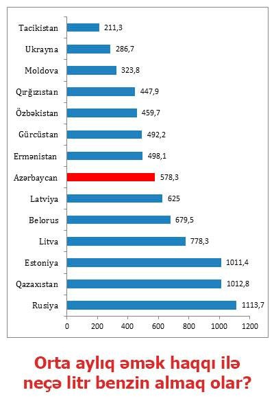Orta aylıq əmək haqqının məbləği ilə benzinin satış qiyməti arasında əlaqə mənzərəni daha aydın təsəvvür etməyə imkan verir. Bunun üçün keçmiş SSRİ ölkələrdə (Türkmənistandan savayı) orta aylıq əmək haqqında nə qədər Aİ-92 markalı benzin almağın mümkünlüyü göstərən qrafiki diqqətiniziə çatdırmaq istəyirəm. Məlumatları müvafiq ölkələrin statistika qurumlarından götürüb hazırlamışam.