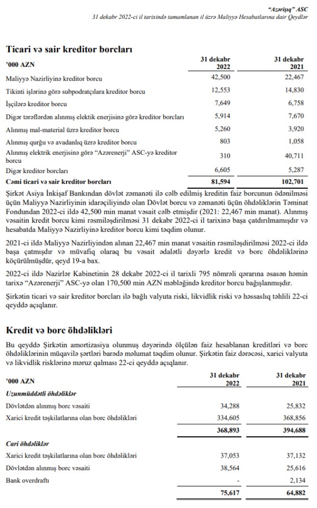 "2022-ci ildə Nazirlər Kabinetinin 28 dekabr 2022-ci il tarixli 795 nömrəli qərarına əsasən həmin tarixə “Azərenerji” ASC-yə olan 170 milyon 500 min manat məbləğində kreditor borcu bağışlanmışdır",- hesabatda bildirilir.