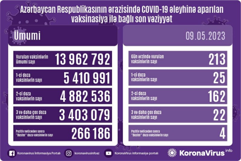 Azərbaycanda son sutkada koronavirus (COVID-19) əleyhinə 213 vaksin vurulub. Bir gündə birinci mərhələ üzrə vaksinasiya olunanların sayı 25, ikinci mərhələ üzrə vaksinasiya olunanların sayı 162, üç və daha çox doza vaksin vurduranların sayı 22, pozitiv nəticədən sonra buster doza üzrə vaksinasiya olunanların sayı isə 4 nəfərdir.