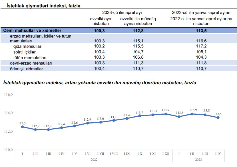 Dövlət Statistika Komitəsinin yaydığı məlumata görə, 2023-cü ilin aprel ayında istehlak qiymətləri indeksi əvvəlki aya nisbətən 0,3 faiz, əvvəlki ilin aprel ayına nisbətən 12,8 faiz yüksəlib.