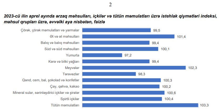 2023-cü ilin aprel ayında ərzaq məhsulları, içkilər və tütün məmulatları üzrə istehlak qiymətləri indeksi əvvəlki aya nisbətən 0,3 faiz, əvvəlki ilin aprel ayına nisbətən 15,1 faiz artıb.