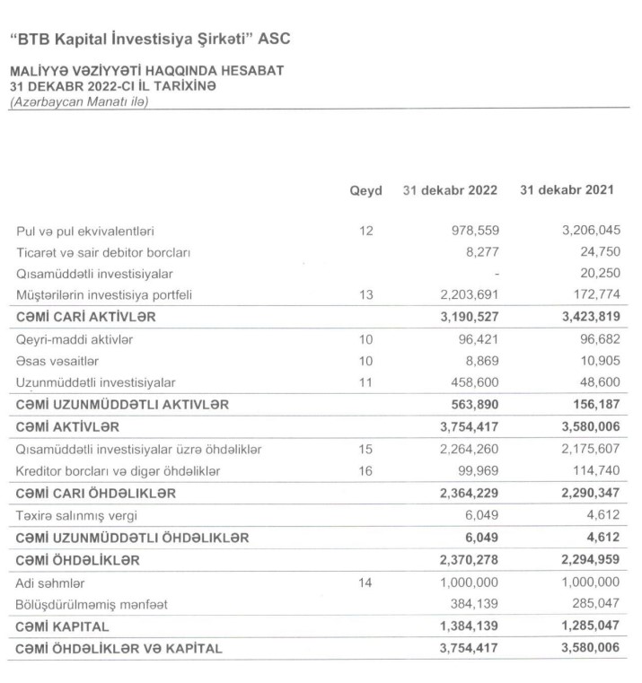 31 dekabr 2022-ci il tarixində "BTB Kapital" 3 milyon 190 min manat cəmi aktivlərə malik olub.