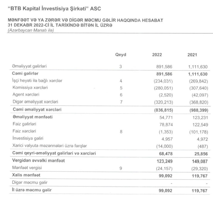 "BTB Kapital İnvestisiya Şirkəti" ASC 2022-ci ili 99 min 92 manat xalis mənfəət ilə başa vurub. Şirkət 2021-ci ili 119 min 767 manat xalis mənfəət ilə bağlamışdı.