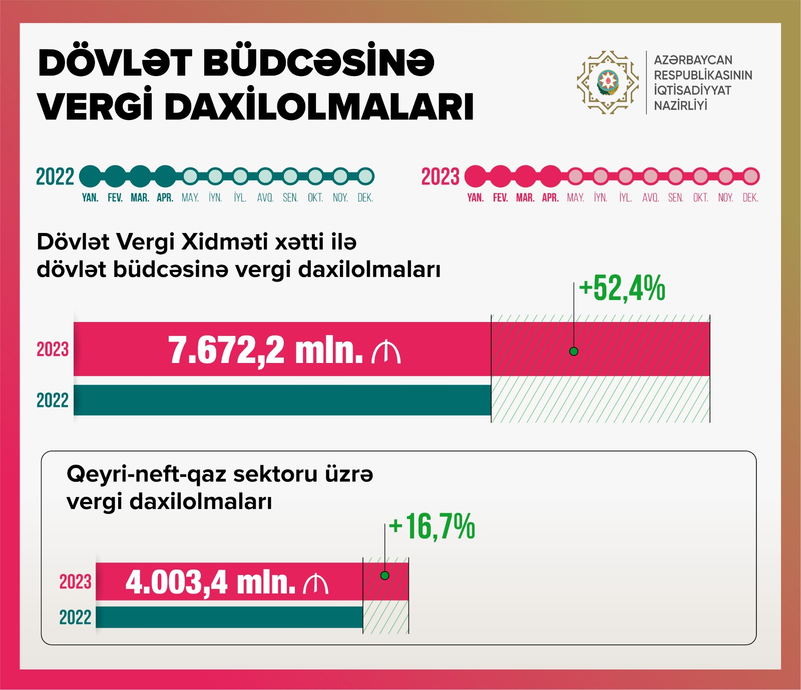Bu ilin dörd ayı ərzində vergi daxilolmaları 7 milyard 672,2 milyon manat təşkil edib2023-cü ilin yanvar-aprel aylarında Dövlət Vergi Xidmətinin xətti ilə dövlə tbüdcəsinə vergi daxilolmalarının həcmi 2022-ci ilin müvafiq dövrü ilə müqayisədə 52,4% artaraq 7 milyard 672,2 milyon manat təşkil edib.
