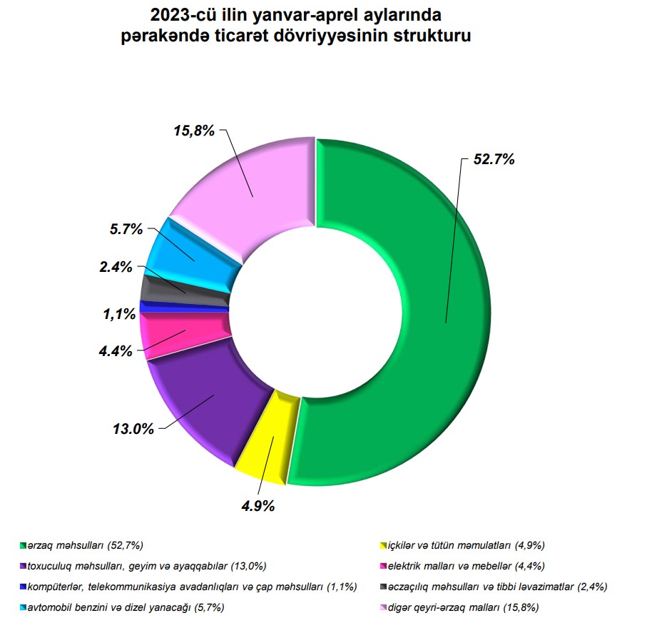 2023-cü ilin yanvar-aprel aylarında alıcıların pərakəndə ticarət şəbəkəsində aldıqları mallara xərclədiyi vəsaitin 52,7 faizi ərzaq məhsullarının, 4,9 faizi içkilər və tütün məmulatlarının, 13,0 faizi toxuculuq məhsulları, geyim və ayaqqabıların, 5,7 faizi avtomobil benzini və dizel yanacağının, 4,4 faizi elektrik malları və mebellərin, 2,4 faizi əczaçılıq məhsulları və tibbi ləvazimatların, 1,1 faizi kompüterlər, telekommunikasiya avadanlıqları və çap məhsullarının, 15,8 faizi isə digər qeyri-ərzaq mallarının alınmasına sərf olunmuşdur.