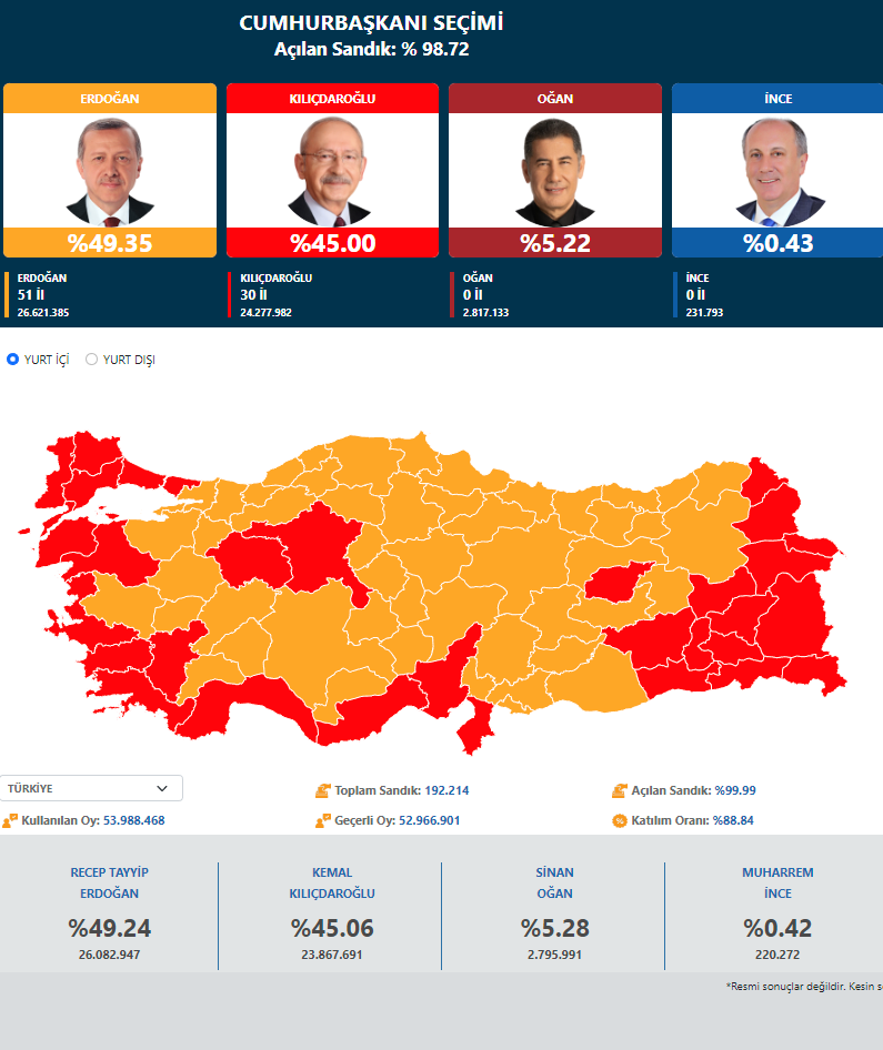 Son məlumata görə, səsvermə bülletenlərinin atıldığı qutuların 98.67 %-i açılıb. Ərdoğanın səs nisbəti 49,35%, Kılıçdaroğlunun səs nisbəti isə 45%-dir.