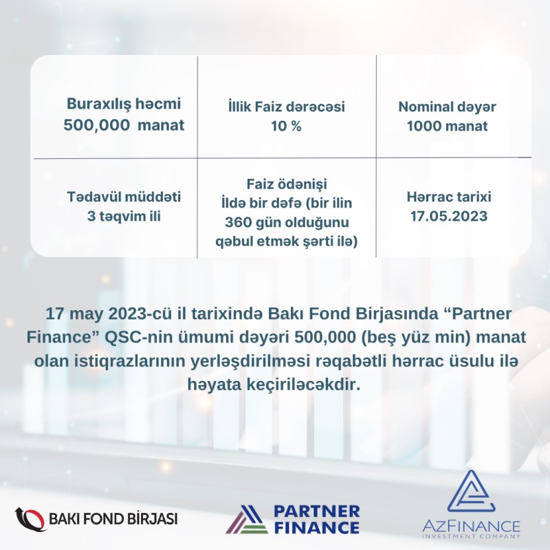 17 may 2023-cü il tarixində Bakı Fond Birjasında “Partner Finance” QSC-nin ümumi dəyəri 500 min manat olan istiqrazlarının yerləşdirilməsi rəqabətli hərrac üsulu ilə həyata keçiriləcəkdir.