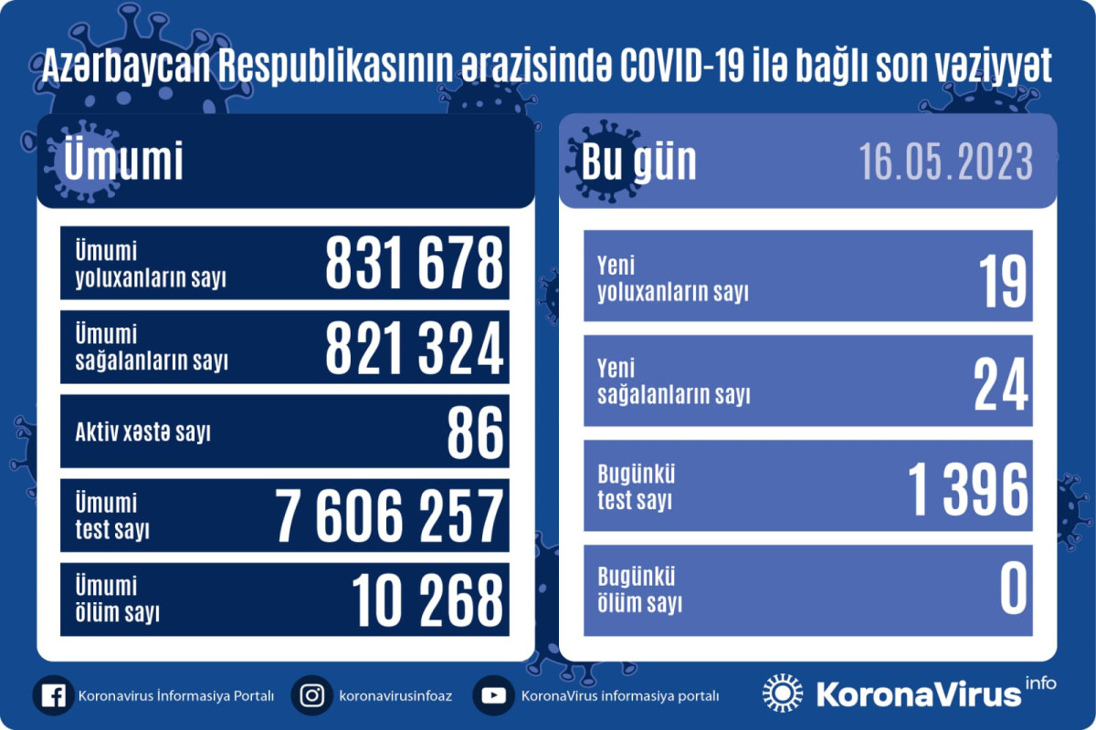 Azərbaycan Respublikasında koronavirus (COVID-19) infeksiyasına 19 yeni yoluxma faktı qeydə alınıb, 24 nəfər müalicə olunaraq sağalıb.