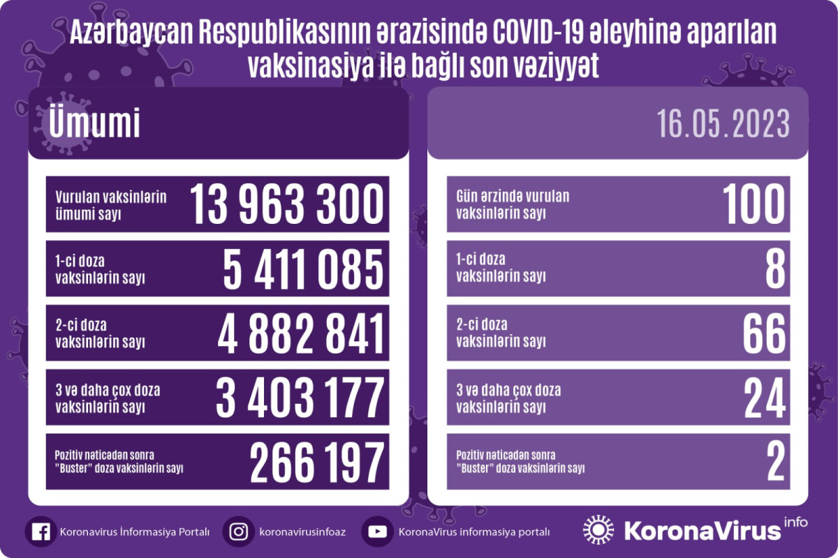 Azərbaycanda son sutkada koronavirus (COVID-19) əleyhinə 100 vaksin vurulub. Bir gündə birinci mərhələ üzrə vaksinasiya olunanların sayı 8, ikinci mərhələ üzrə vaksinasiya olunanların sayı 66, üç və daha çox doza üzrə vaksinasiya olunanların sayı 24, pozitiv nəticədən sonra buster doza üzrə vaksinasiya olunanların sayı 2 nəfərdir.