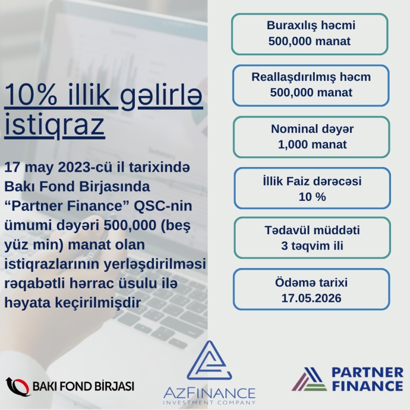 17 may 2023-cü il tarixində Bakı Fond Birjasında “Partner Finance” QSC-nin tədavül müddəti 3 təqvim ili, nominal dəyəri 1000 manat olan AZ2005021962 dövlət qeydiyyat nömrəli, 500 min manat həcmində olan, faizli, təmin edilməmiş sənədsiz, adlı istiqrazlarının yerləşdirilməsi üzrə hərrac yekunlaşıb.