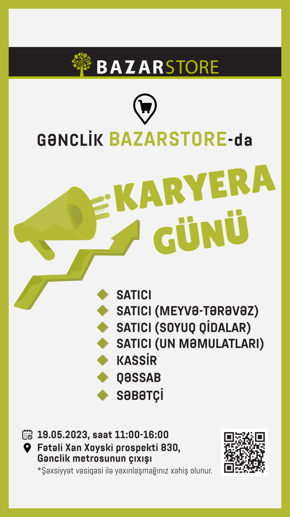Mayın 19-da Gənclik metrosunun yaxınlığında yerləşən mağazada “Karyera günü” keçiriləcəkdir.